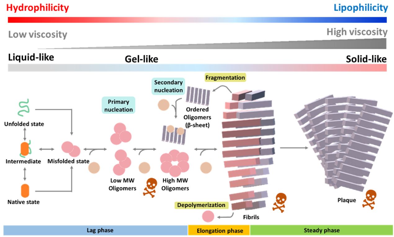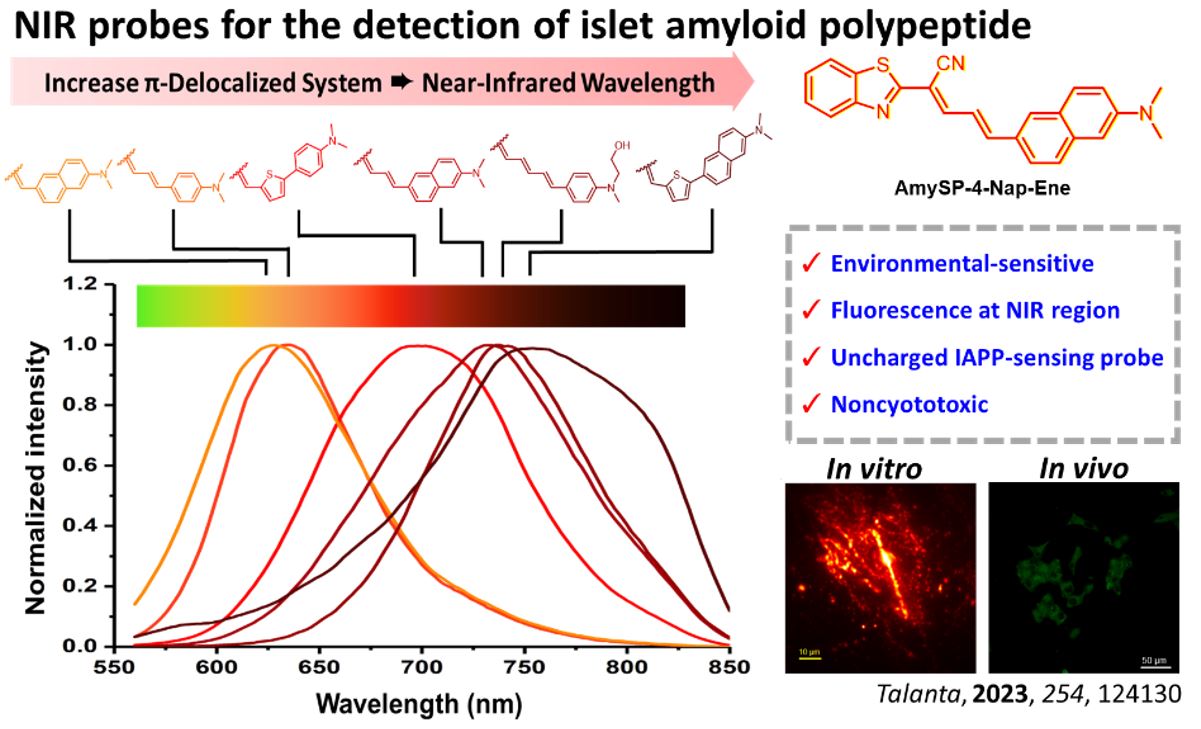 本實驗室依據蛋白沉澱過程的特性,設計可以有效偵測IAPP聚集沉澱過程的螢光分子轉子探針。首先以黃酮類化合物為基礎,設計出具高選擇性且無細胞毒性的螢光探針,可有效偵測IAPP纖維沉澱並用於細胞顯影(Biochemistry 2020, 59, 1482)。進一步,利用組合式化學開發新一代探針AmySP-4-Nap-Ene,該探針與IAPP結合後有明顯螢光強度增強且螢光放光波長具有明顯的藍移(Talanta 2023, 254, 124130),展現優異的靈敏度與應用潛力。此外,也設計出以胡椒酸為骨架的分子調控子,可顯著加速IAPP聚集並調控其生物活性,為治療策略提供新方向(Chem. Comm. 2023, 59, 10660)。