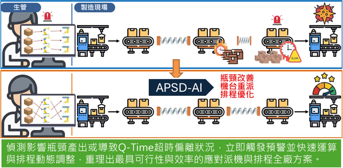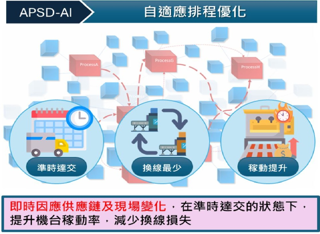 面對市場需求日益多樣化、高度客製化,以及全球供應鏈不穩定等挑戰,傳統的生產排程與調度方式已難以因應現代製造環境中「高變動、即時性」的運作需求。儘管企業已導入 MES、IoT 等數位化工具,實現現場數據的即時蒐集與初步整合,但若缺乏具備預測性與自動調整能力的智慧排程架構,仍無法即時因應外部市場需求的快速變化與內部廠區各類突發狀況。在實務運作中,調度決策往往仍仰賴人工經驗與人員之間的通知流程,導致反應時間冗長、協調效率不佳,難以建立具備彈性與韌性的供應鏈系統。 本研發輔導案協助業者開發出具備自我調整與快速回應能力的即時排程系統(APSD-AI, Adaptive Planning, Scheduling & Dispatching AI System),可依據實際現場與需求變動,自動優化生產排程與調度決策。APSD-AI是有效提升產線與供應鏈對外部需求變動與內部突發事件的即時反應能力,強化整體系統的敏捷性與韌性,協助企業邁向智慧製造的新階段。此系統整合 APS、RTD(Real-Time Dispatching,即時派工系統)與 AI 模型,構築一套具備中長期規劃與即時調度能力的智慧排程平台。